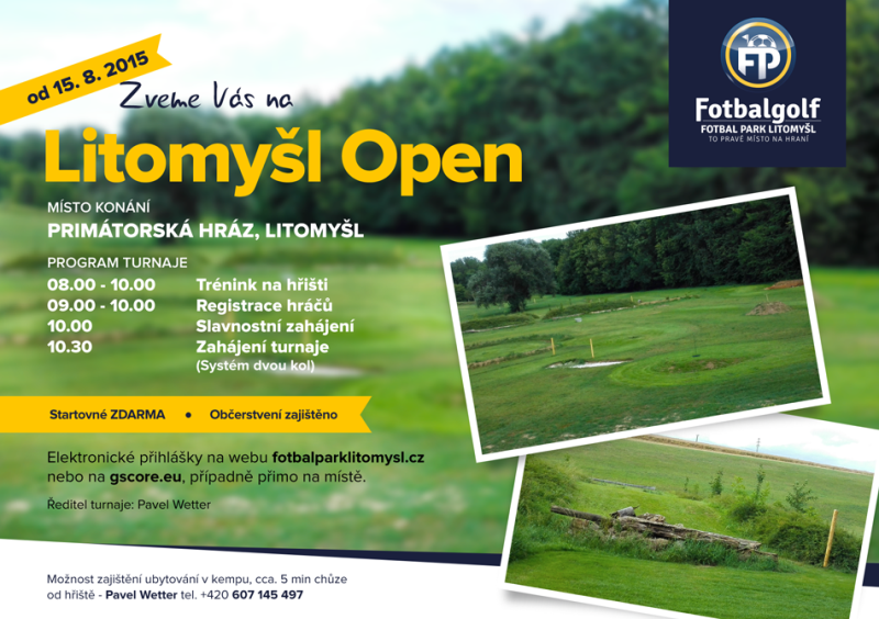 U příležitosti otevření fotbalgolfového hřiště v Litomyšli, Vás zveme na otevírací turnaj Litomyšl Open 2015. Přijďte si vyzkoušet naše nové hřiště a poměřit si své síli navzájem.