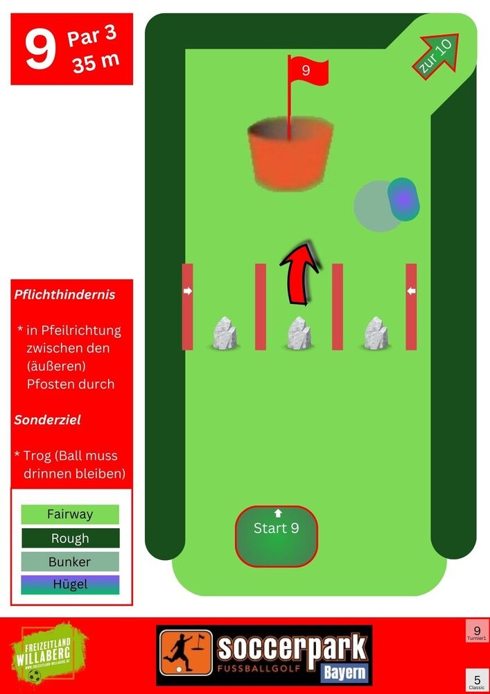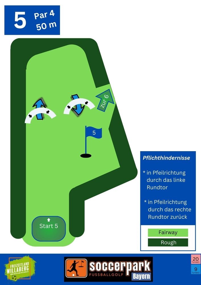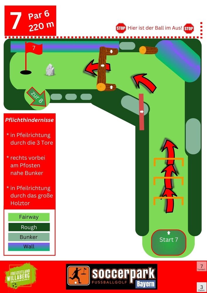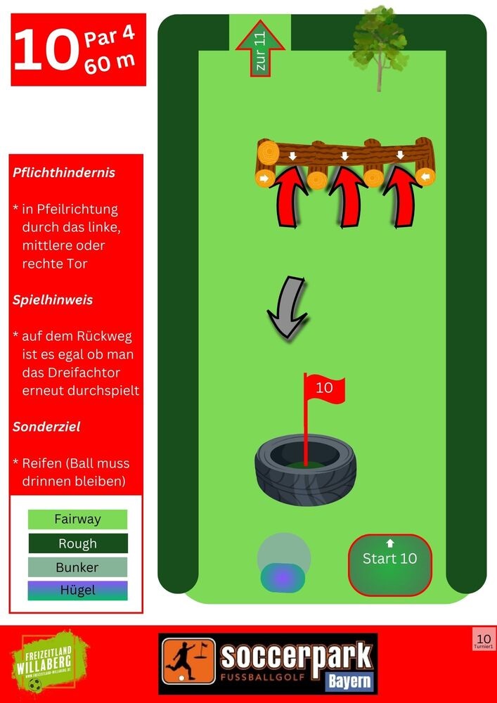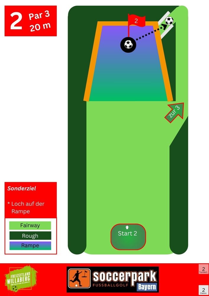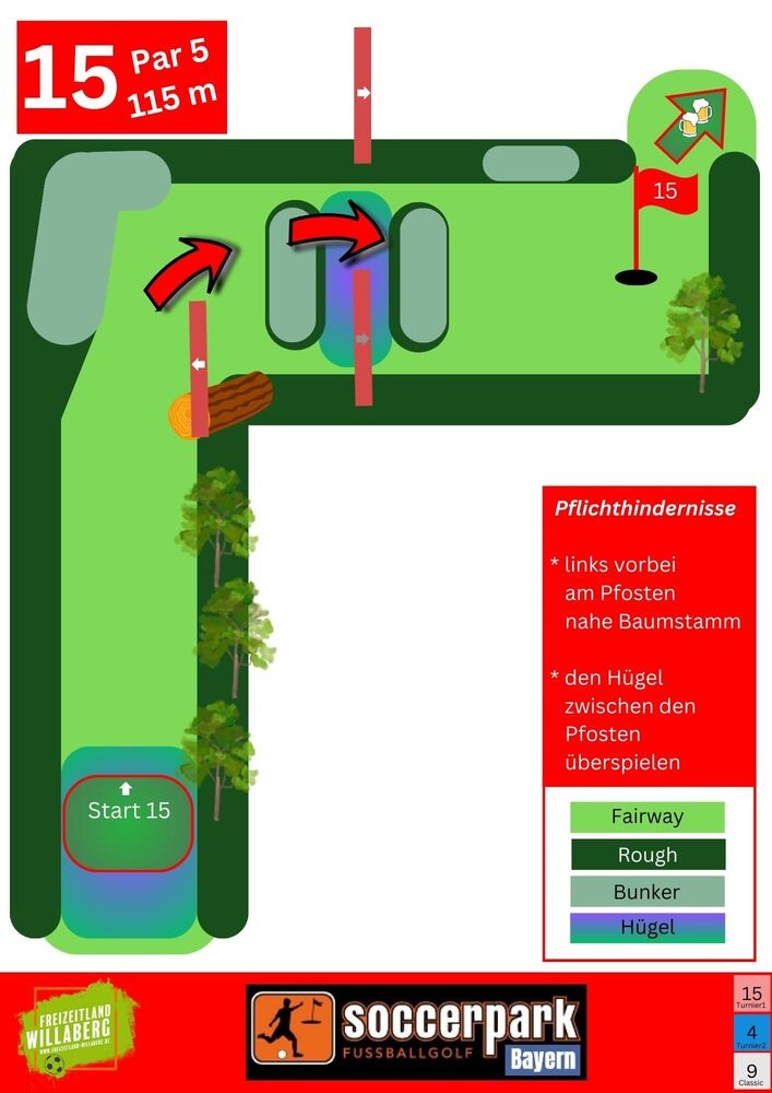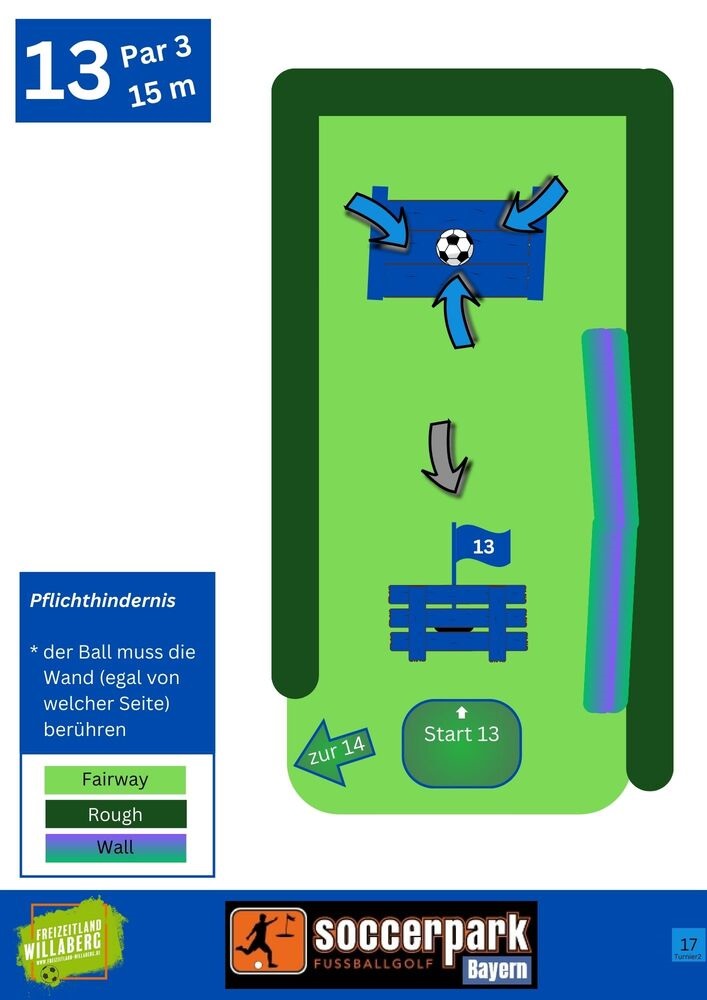 Ab Saison 2025 wurde die Anlage auf 30 Loch erweitert und besteht nun aus einem Kurs mit 15 rot und einem Kurs mit 15 blau beflaggten Löchern. Die Bahnen sind zwischen 20 und 220 Meter lang, die Gesamtstrecke aller 30 Bahnen beträgt ca 2 km. Man sollte (je nach Gruppengröße) für den roten oder blauen Kurs rund 1,5 bis 2 Stunden Zeit einplanen. Fussballgolf ist ein Freizeitspaß für die ganze Familie von jung bis alt. Geübte Fussballer sind dabei aber nicht immer im Vorteil ;-)