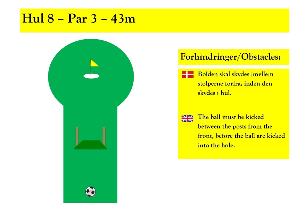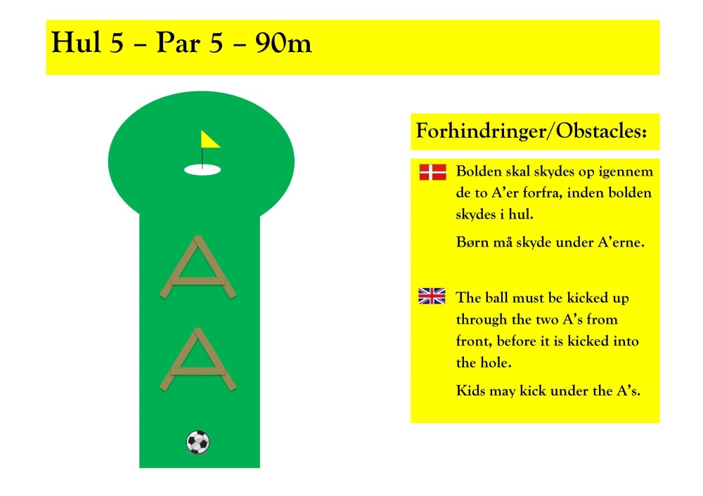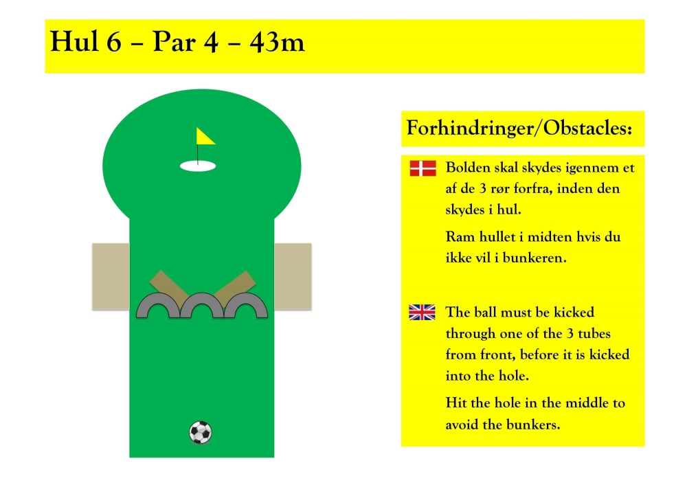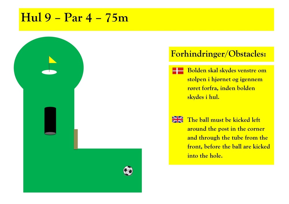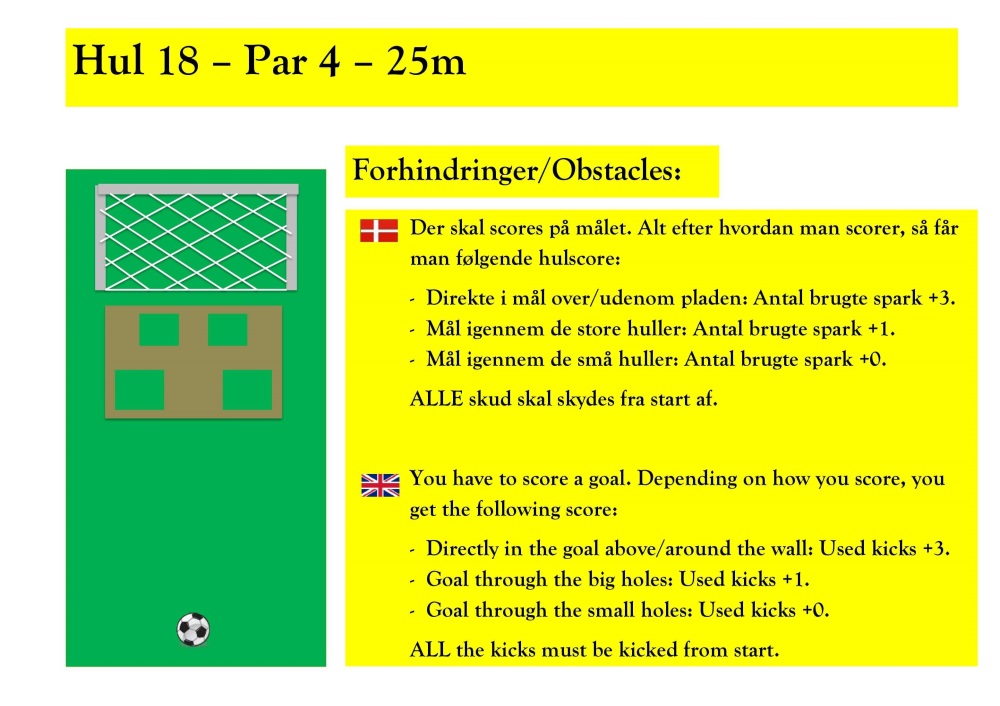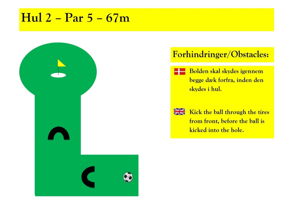Vi tilbyder jer hele 36 hullers fodboldgolf, fordelt på 2 baner á 18-huller.
